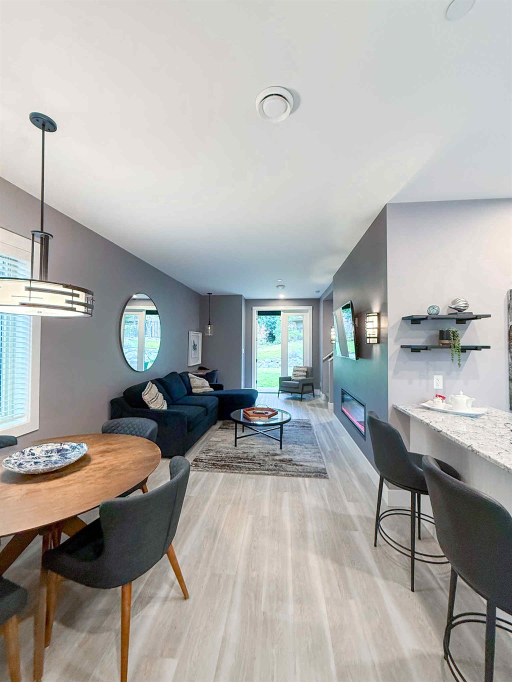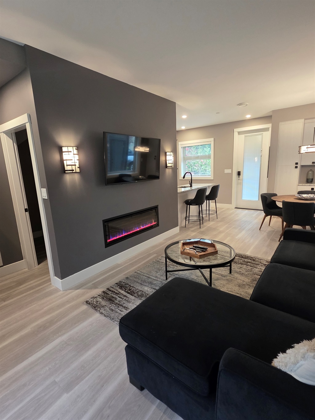 Living Room — includes a queen pull-out sofa, fireplace, and smart TV for streaming.